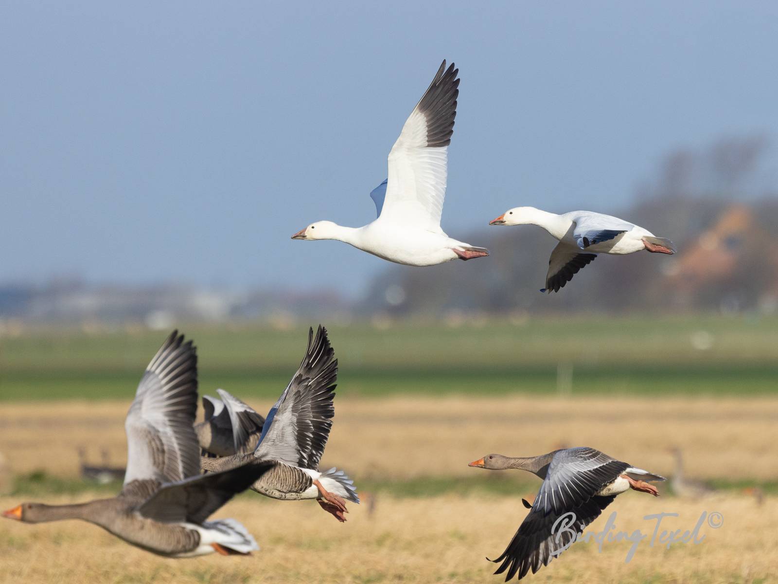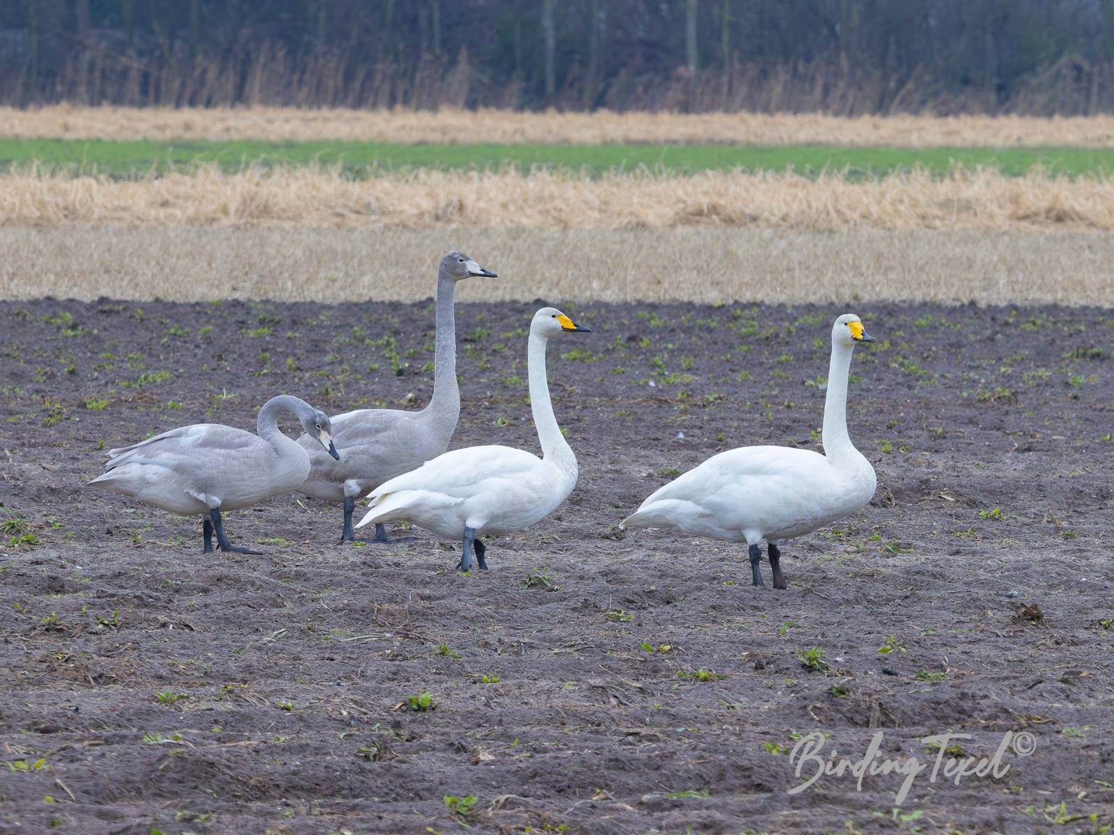 In de eerste weken van 2023 waren de meest opvallende soorten, twee Sneeuwganzen (status onbekend), een Dwerggans en een verdwaalde Koereiger. Sneeuwgorzen zijn ieder jaar present, weliswaar in kleine aantallen. Smienten daarentegen overwinteren in grote getalen op Texel. Langs de kust, in kweldergebieden als de Slufter en de Schorren worden in deze periode van het jaar altijd Oeverpiepers waargenomen. Wilde Zwanen zijn schaarse wintergasten. De adulte vogels op de foto zijn waarschijnlijk dezelfde als in vorige jaren. Nu met gezinsuitbreiding!